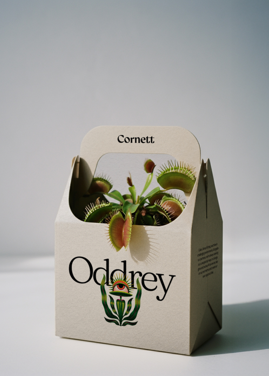 The visual identity is anchored by Oddrey, a colorful, one-eyed carnivorous brand mark that embodies Cornett’s approach. “Oddrey represents our values in motion,” said Hiler. “She’s watchful, she’s strategic, and when it’s time, she’s deadly effective.”