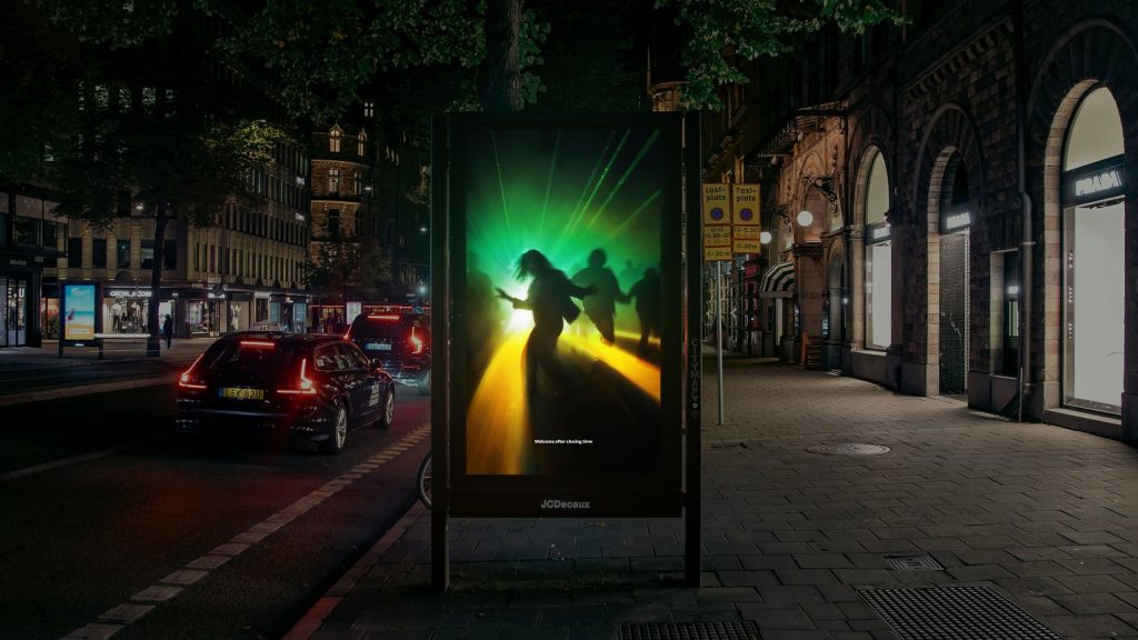 In McDonald’s latest outdoor campaign in Sweden, the feeling of nightlife is captured through images inspired by the energy and movement of the dance floor. Lights and laser shapes create a playful expression that subtly alludes to the brand’s iconic golden arches. The campaign becomes a natural part of the city’s pulse and reminds people that McDonald’s is there when the night draws to a close.
