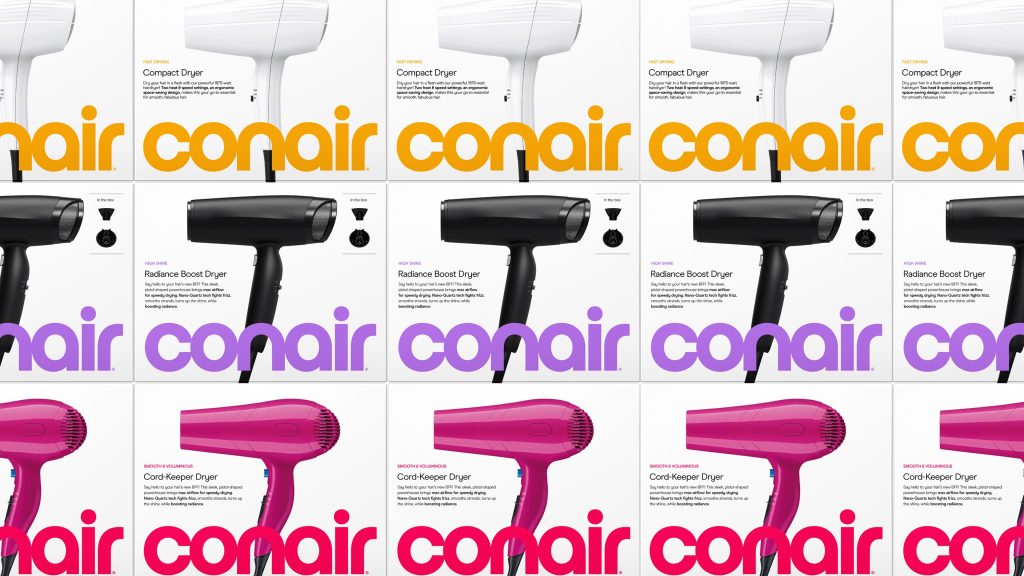 Mrs&Mr, a creative partner in brand positioning, visual identity and creative, created a streamlined design system that works across digital channels and packaging that is approachable and intuitive at shelf, online and across social channels. The design offers the flexibility a global category-leading brand like Conair requires to manage its breadth of products.